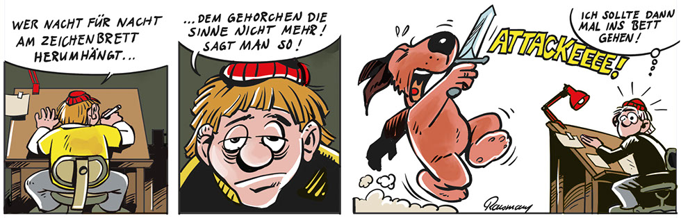Wer seinen Job liebt, der schläft auch mit ihm ein – am Zeichenbrett. Und wenn dann die gezeichneten Figuren vor dem geistigen Auge mit Schwertern fuchteln um Aufmerksamkeit buhlen dann wirds Zeit das Bett aufzusuchen.